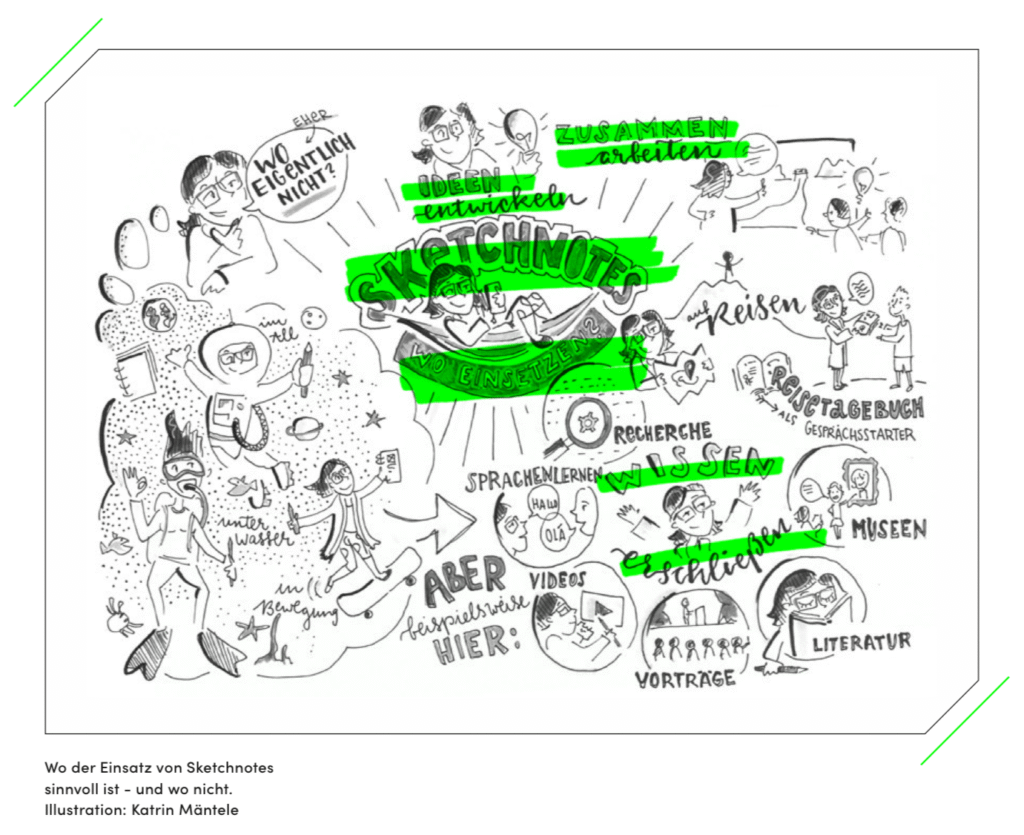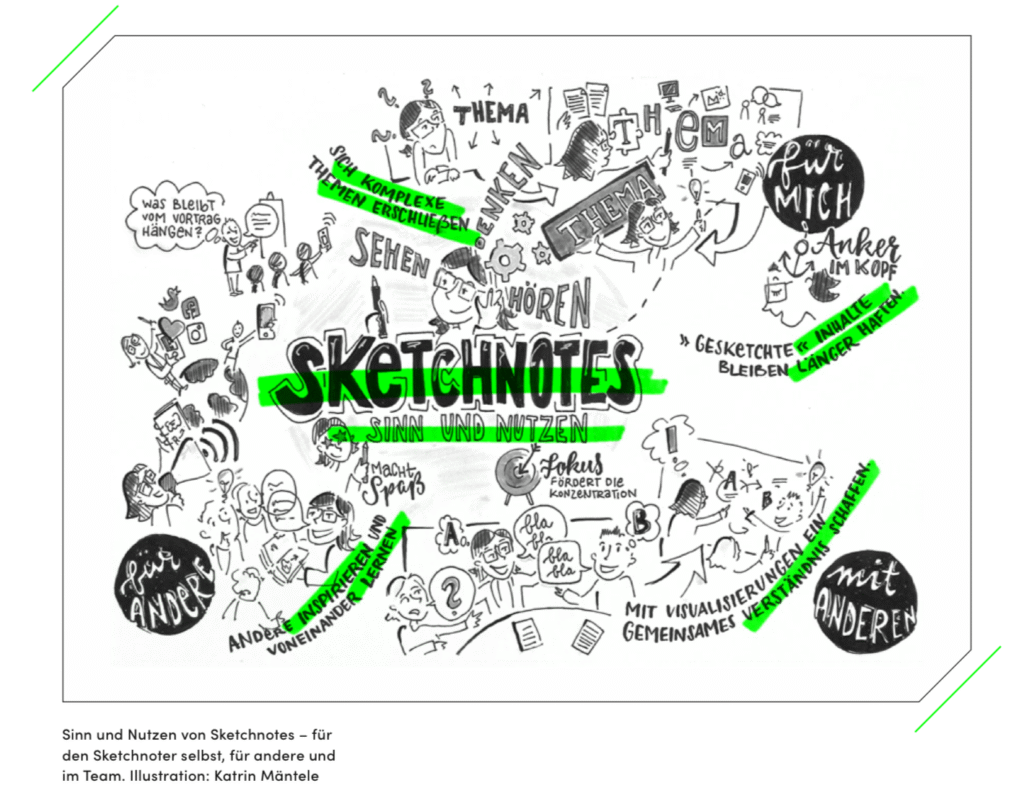 Ab Seite 40 geht es los mit Visualisierungstechniken und dem Interview mit mir. Ich erzähle wie ich Sketchnotes und andere Techniken der Visualisierung beruflich und privat einsetze.