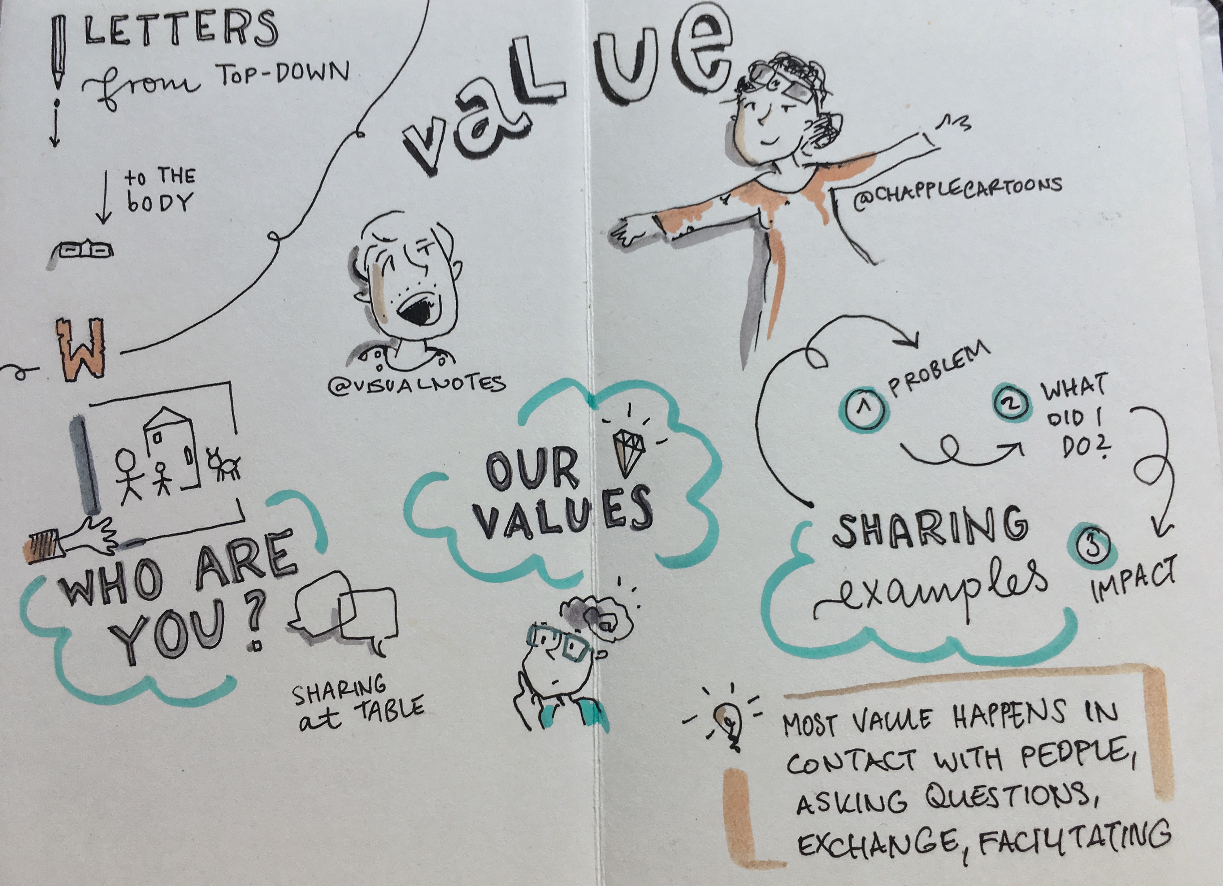 Für mich hätte es keinen besseren Abschluss geben können. Die Erkenntnis aus dieser Session war, dass wir als Sketchnoter dann Wert schaffen, wenn wir in Kontakt mit Menschen kommen, Fragen stellen und in den Austausch gehen.